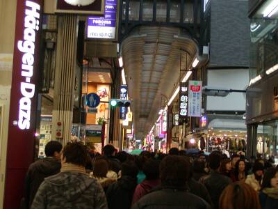 ![]() | アーケードの途中に突如として信号がある不思議な街、難波。雨が降っていたのもあってスゴイ人混みだ。 |