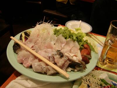 ![]() | ふぐ鍋の材料。他にてっさ(ふぐの刺身)もあった。 刺身NGのE.T.でも、てっさだけは美味しいと思って食べることができました。 |