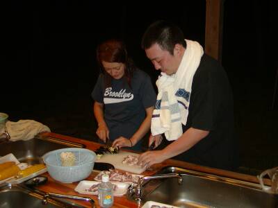 | 料理長によるバーベキュー準備。 今年からは焼き場選挙禁止令が発令されているので、ココで切っていきます。 |
