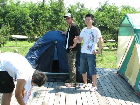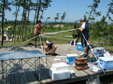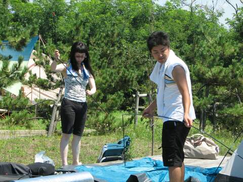 | 新規購入の3人用テントを見事完成させた二人。 | Ru-mino氏持参の屋根。意外と手間取る。 |