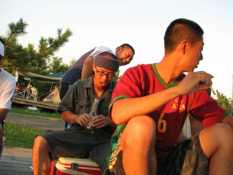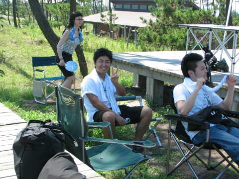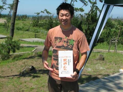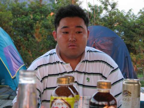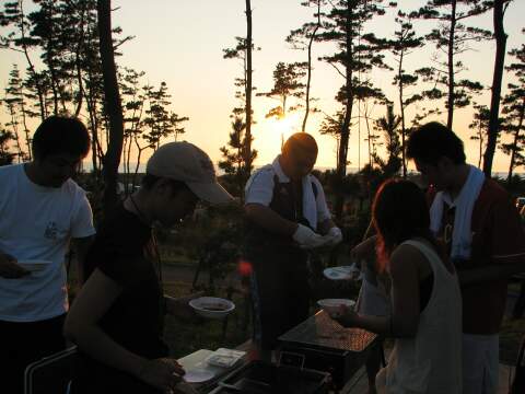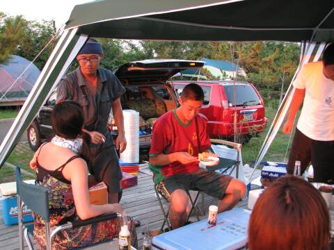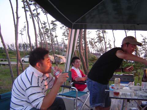| 日本海に沈みかける夕日をバックに、肉を焼きまくる。 | 今回キャンプ初参加、のたっくん氏。 Before/Afterで比較して〜! |