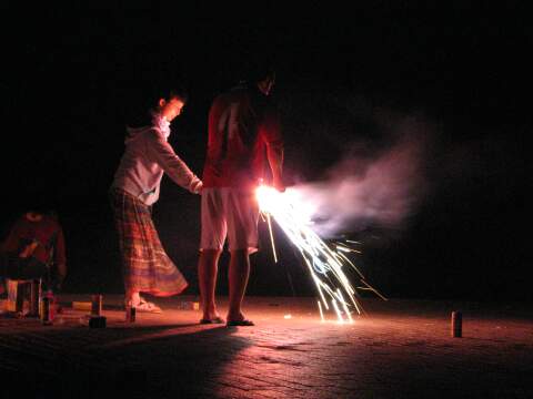 | まったりと花火を楽しむ☆佳とM氏。 が、このあと事件発生! ロケット花火の直撃を受けて負傷。 |