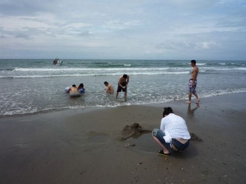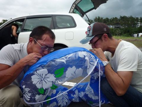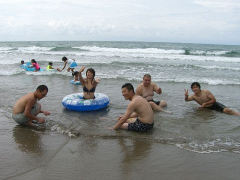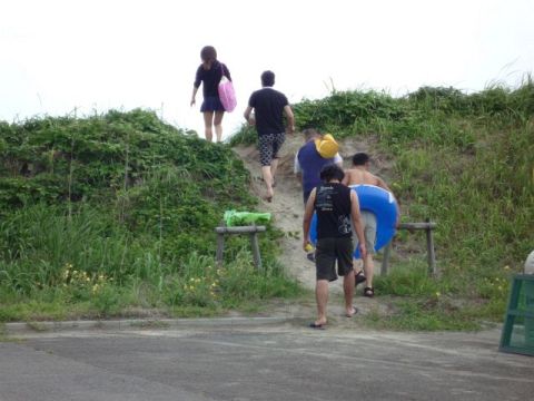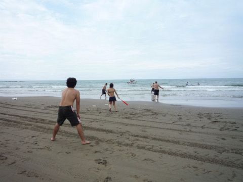| 膨らませた浮き輪を持って、早速海岸へ。 | Play ball!! |