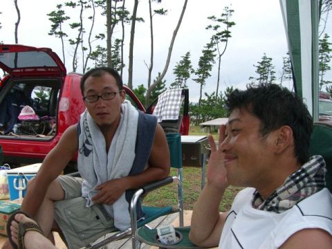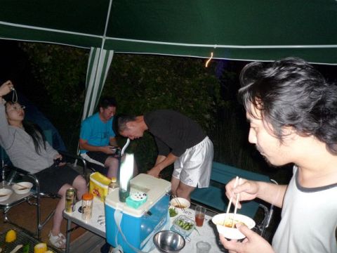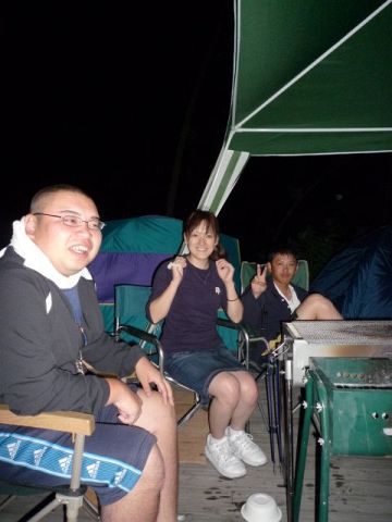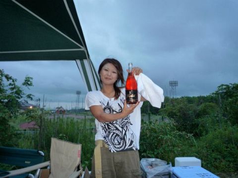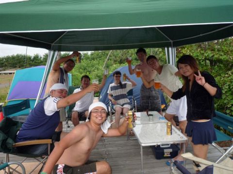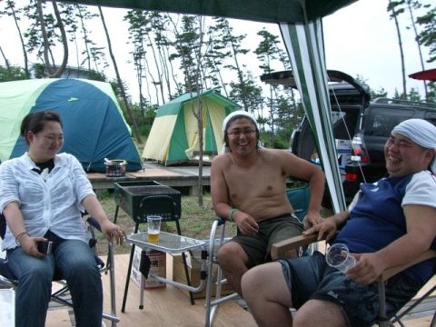 | 今回のキャンプでは過去最大の4張ものテントを設置、お疲れ。 | そんなわけで、まず喉を潤す 野球部マネは社長席へ。 |