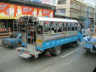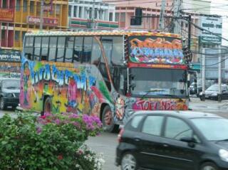 わかりません、この柄の意味。路線バスのようなスクールバスのような、かなり頻繁に走っているのを見かけました。 タイって、町並みは結構地味な色合いが多いのだけど、時々ド派手な色遣いの車や家があるから見てて面白い。 原色一色の家とか、金ぴかの門とか。