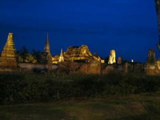ワット・マハタートのライトアップ。夜に遠くから見ればキレイな感じがするけど、実際は破壊されてボロボロです。 というのも、ビルマ(ミャンマー)に侵攻され、アユタヤ王朝は街ごと焼き払われたらしい。