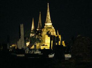 続いてワット・プラシー・サンペートのライトアップ。それぞれの塔には、アユタヤ王朝を治めた歴大王の骨が納められているそうです。 翌日その上に乗っかってきたけど。。。