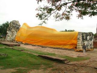 ワット・ロカヤスタにて。ワット=寺院なのだけど、ここにあるのはリラックスした姿勢の仏像一つ。 元々は立派な建物があったのだろう。(後ろには基礎らしき跡があった) 横幅(身長?)は約50m。
