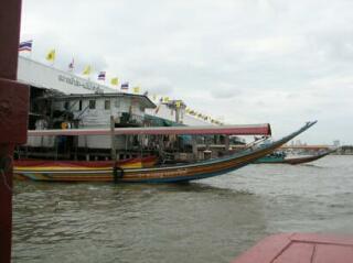 チャオプラヤ川を渡し船に乗って。乗船したのは観光用でも何でもなく、一般庶民が利用する渡し船。(片道3バーツ=約10円) 船着き場には小さな市場もやっていた。 川がメチャクチャ汚い。水質汚濁何とかしろ〜!