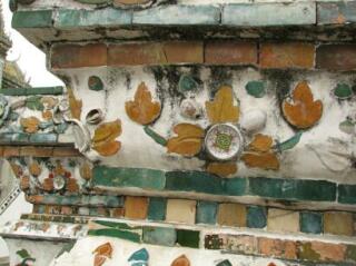 ワット・アルン近影。表面には色鮮やかな中国製の陶器がはめ込まれている。(花の模様の中心は茶碗の底) よく見てみると、陶器のカケラが散らばっていた。