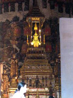 ワット・プラケオの本堂内に安置されている仏陀像。エメラルド寺院と呼ばれるのは、この仏陀像がエメラルド色の翡翠でできているから。 ワット・プラケオはタイ国内で唯一僧侶が住んでい、王宮が管理を行っているお寺。 なので警察・軍隊がそこら中を警備してました。